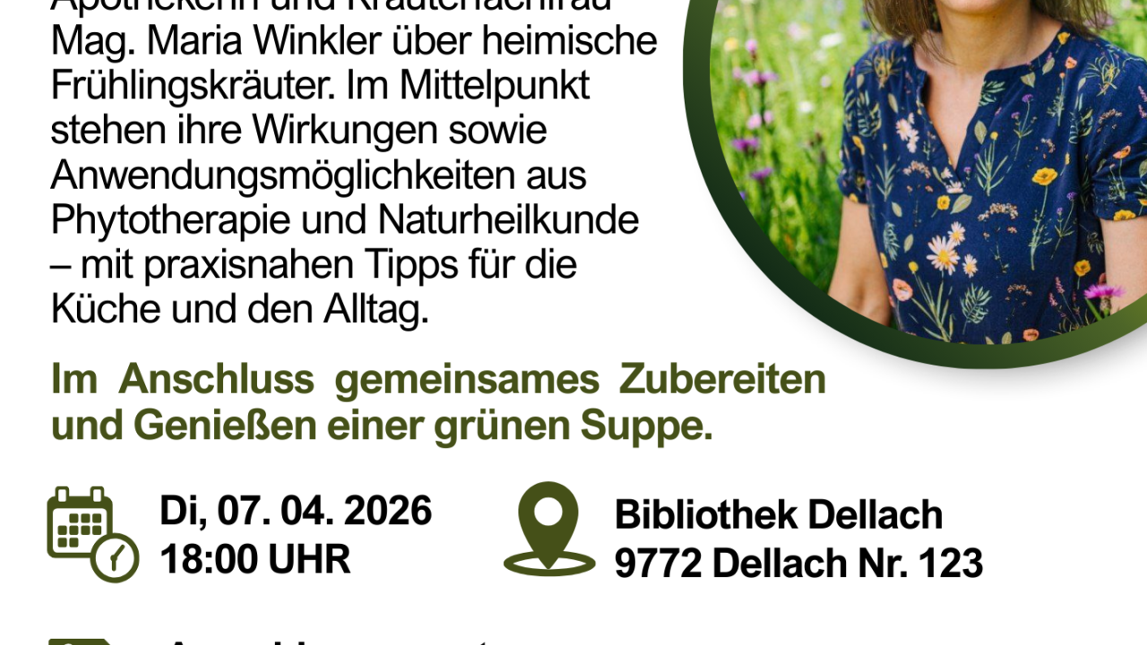 Vortrag und Workshop mit Apothekerin und Kräuterfachfrau Mag. Maria Winkler über heimische Frühlingskräuter. Im Mittelpunkt stehen ihre Wirkungen sowie Anwendungsmöglichkeiten aus Phytotherapie und Naturheilkunde – mit praxisnahen Tipps für die Küche und den Alltag.