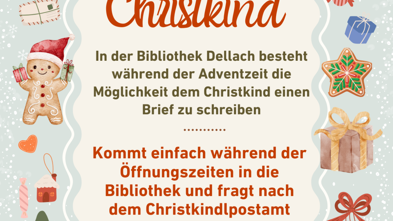 Dezember, 2025 Brief ans Christkind In der Adventzeit besteht während unserer Öffnungszeiten die Möglichkeit einen Brief ans Christkind zu schreiben und abzuschicken. Fragt einfach am Ausleihtresen nach dem Christkindlpostamt.